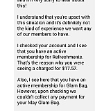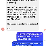 I never received the first two glam bags, and have received nothing so far but they already charged my credit card. SO I cancelled my membership, then they told me I actually have TWO memberships (I never took out a second membership with them). They said they would cancel that for me also. However, still have not received a single product from this business. The tracking numbers they send you, there is no information on them other than it's a tracking number but does not say whether your bag is in transit. There is something fishy about it. After reading other reviews online, I should have not dealt with this business to begin with.