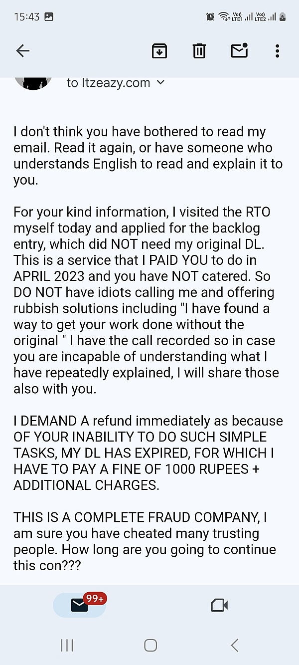 I placed the order for my Bike NOC transfer on 27th of Jun 2023, My order Id is BLRRTNO*******, still the work is not completed it been 52 days and still there is no response from them, support executive are not picking my calls and senior members are also not responding and not providing any solution, I am worried about my original RC which they are not returning now, I am thinking to file a criminal complaint again Itzeazy.