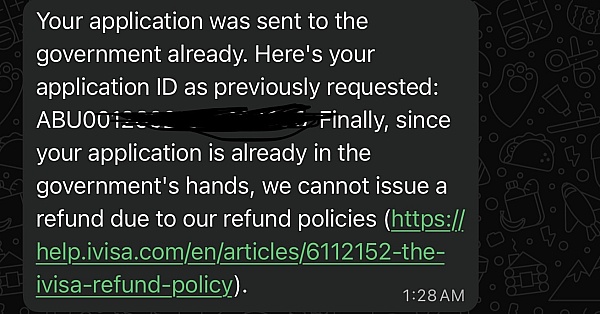 I found out after, not only does Thai Immigration warn about using such services, but its actually free to do via Thai Immigration (if you can filter past all the paid links from iVisa). Furthermore, iVisa did not collected all the mandatory and required information in order to submit a successful application! As such, the application was not only not yet submitted but it was also incomplete. Under the refund policy of iVisa this substitutes a 100% refund which they refused. They continued to give me the run around for several hours, passing from one chat bot, to the next, to a operator and so on. It was a very annoying process. After making some complaints online they finally refunded me.