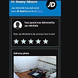 This is what I sent to JD. Dear Customer service team. I purchased a item which was a Adidas predator football shoe. I also requested next day delivery. I had a notification that it would be delivered by Envri and it would be here between 1 pm and 2 pm. Throughout the day I have been checking the status of my item and I've had a picture of a box in a hand outside my house. Not on the porch on actually delivered to my door.