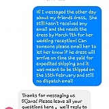 Finally got to speak to an agent. I have been told that my dress is not yet ready and that due to the virus they have suspended deliveries. This is BS as I have recieved other items I have ordered from China. They are telling me that my dress is not ready because of the virus yet I ordered in January. Absolute joke. You do not get any communication from them unless you post a review here. So guys when you read this and ask me to take it down again please note I will continue to post negative reviews daily unless I receive my order BEFORE 7 March
