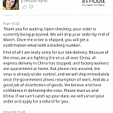 I ordered a dress around January 20 with standard delivery of 14 days. It's now February 15th and no dress no communication until I called them. Getting this response. " First of all I am really sorry for our late delivery. Because of the virus, we are fighting the virus all over China, all express delivery in China has stopped, and factory workers are quarantined at home. But please rest assured, the virus is already under control, and we will ship immediately once the government allows resumption of work. And do a good job of disinfection of goods. We believe and have confidence in defeating the virus. Please trust us and China. If we can't catch up your date, we will cancel your order and apply for a refund for you."