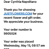 Answer: Barbara Churchill, we are writing to inform you that your order 9745231 to Heather Churchill has been cancelled, and if you were charged, your account will be credited. The credit will take 1-4 business days to appear on your charge account. If you have any questions please do not hesitate to contact us by either replying to this email or by calling us. Sincerely, JUSTFLOWERS.COM 800.716.7559 [email protected] SMS: 323-410-2510