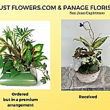 I ordered from JustFlowers: a plant in a ceramic bowl called "Delightful Dish Garden" and I upgraded to "premium" meaning more plants. JustFlowers had Panage Florist in San Juan Capistrano CA make the arrangement & deliver. The recipient sent me a photo upon receipt. Not only was I in shock; but I was humiliated and embarrassed that my friend thought I would send such a piece of crap. There was no ceramic dish, but the plant was in a cheap white Easter looking basket. The arrangement was not premium but smaller than the regular arrangement ordered (in photo). I had several conversations with JustFlowers who said they had conversations with Panage Florist. JustFlowers wanted me to get more photos of the delivered arrangement! Why? I sent them the photo & refused to get more from my friend. JustFlowers said there is nothing they could do because Panage Florist said they sent what they had! JustFlowers said in small print it says arrangement & container may differ from photo. No kidding! I will never use JustFlowers again nor will I ever use Panage Florist directly.