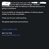 I ordered flowers for my mom on the Thursday before Mothers Day. I checked with / other companies first, but went with JustFkowers because they assured me they could get the arrangement there by that Saturday. Then I got a text saying Sunday. Then one saying Monday. Then one saying Tuesday. I do not know if they have been delivered, even now. I would never have ordered if they had been honest in the first place and acknowledged that they could not deliver when requested.