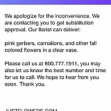 Update: I received a muffled voicemail from a man named Richie and I literally could not hear a word he said. Like It sounded like there was a fan directly next to the phone? Impossible to even hear the call back number! I am so baffled by this entire unprofessional situation. Flowers are an emotional gift and this has been handled so carelessly.