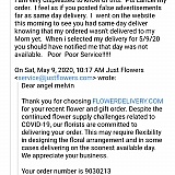 These people are terrible. Not only did they not deliver flowers at the time their website promised, they do not answer the phone in order to follow up as to where the order is. They ask you to email them in order to follow the the delivery of your purchase, but then they do not respond. Will never use them again. Am reversing the charges on my card as they still have not delivered Mothers Day flowers and it is almost 5pm on Monday the 11th.