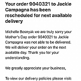 Ordered flowers to be delivered Mother's Day and was sent a email late in the evening on Mother's Day that they would be delivered on another day. Didn't even say what day that would be. I would have ordered from a different company that would have delivered on Mother's Day if I knew that. Why take orders for a special day like that when you can't deliver that day. They still want full price even though they won't be there on Mother's Day. Thanks for ruining my moms surprise gift on Mother's Day. I emailed them back and got no response. Order from someone else if you want it on a special day.