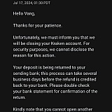 I just wire transferred 9450USDT into my kraken account and it went through into my kraken, it's already popped up with pending, on hold. Then I went sleeping that night. When I woke up I just checked my kraken account, and they send me this mail like this, now I've been waiting for refunding my money into my bank account but it doesn't show up anything after a week