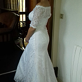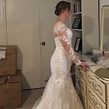 So pleased with the way it looks and fits! The lace, and train, and sleeves are so pretty! The quality & professionalism are appreciated. We will certainly order from LaLaMira again!