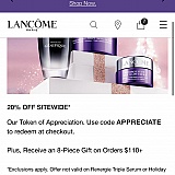 I had a very very bad experience shopping at Lancôme website. I brought a bundle with great discount and they happen to lost my package, and had to reorder for a higher price (uh huh, they will NOT honor you the promotion price even if they lost your package). For my second order, I sign up with another email and get a 15% off welcoming offer, and use it with the purchase with gift promotion. Beware that Lancôme's promotion CANNOT be stacked. If you use a promotion code, you cannot get the gift with purchase even if you double and triple confirm with the online chat rep. The gifts that were promised at purchase will NOT come, so the specials are not even worth it. There is nowhere in the web site tell you that you can't add your promotion code with gifts. No notice given, It's just a false advertisement. Called the Customer service and they can't do anything to help this. Never shop at Lancôme ever again! Greedy company and very unhappy experience.