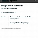 Honestly, this company is a joke. Be careful when ordering off of Amazon as the seller may ship using them. This is my second time dealing with a seller who used laser ship and my package is again late. First time it said it got lost but was scanned into their building. Package was either stolen or they were to lazy to drive across the city to deliver it even though they were paid to do so. And yet again my package is late after being scanned into the building, soon to disappear into oblivion. Company is terrible and I can't see why any seller would use them. Not only do you lose stock but your out on the money too.