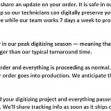 Hi, David. Thank you for your feedback. I have found an order in our system that matches your contact information, and your film reels are still safe in our facility. I am sorry that our current turnaround time is a bit longer-than-average. I am going to send a status update to the email address on file on this order. Please let me know if you need anything else.