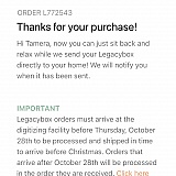 After waiting more than 8 weeks and continuing monitoring legacybox webpage for updates on my orders without any decent progress, I decided to contact them, and all I was given were excuses and apologies. After talking to them for more than 20 minutes, they finally decided to give me some priority on my order. Which I was good with. 3 days later their webpage posted my order was completed and shipped out. Great I said, but what a nice surprise, all I received back were the same 2 VHS, s and one 8 mm cassette. Immediately I call them, and they initially said my order was completed and was on m way. When I told them I already received the box with no digitalized item, they gave me the excuse my cassettes have some mold or were with some kind of damage. I asked them why their webpage said the order was completed, they had no answer. They promised to send me a full refund,, and again, they did no sent a full refund, giving the excuse they need to cover the shipping charges, "for a service not completed". I wasted 3 months waiting for them and nothing, and at the end they kept some money from me. LEGACYBOX IS A FRAUD!