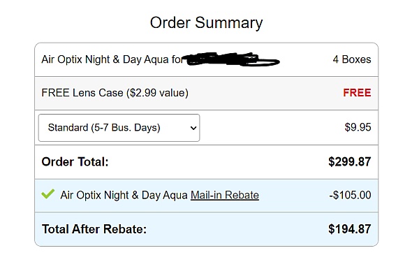 The "rebate" system is ARCHAIC! I won't be ordering from lens.com again just for this reason. Overpriced! You require us to physically remove the proof of purchase from the contact lens boxes and mail them to a separate address plus pay for shipping and tracking. Why don't you just do the rebate yourself and pass the savings on your customer like normal companies? I'll be mailing it off tomorrow and we'll see if I actually get a rebate debit card for $101. Shame on you lens.com. Your rebate requirements are ridiculous.
