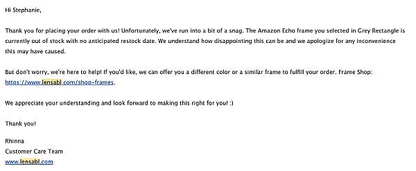 I placed an order around Black Friday and requested Lensabl to send me a box to ship my existing frames + lenses on Black Friday 11/29. I then experienced radio silence. I once or twice logged into my account, saw that a shipping label had been printed, but nothing else. After I took the time to escalate a case with customer services, I eventually saw a shipping notification some 2 weeks later, after I'd placed the initial order. Fast forward, it took 4 weeks for my order to ship. From cradle to grave, 6 weeks. Roadrunner would have been caught by Wile E. Coyote. Based on this snail pace, I'll use a competitor next time.