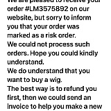 I ordered two wigs and had a coupon code which gave me $161 off. The next day they sent me an email stating they couldn't process my order due to it was marked as a risk and then sent a second email stating it was cancelled due to unforeseen circumstances and that I needed to reorder. I tried to reorder and my discount worked but when I went to check out the price switched. Whatever discount code they give you the price is reversed when you go to pay and if you don't pay attention you will pay them more than you agreed to pay. Apparently their scam didn't work when I placed the first order which is why they cancelled it. It was my first time ordering and I'm glad I caught on before it was too late.