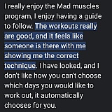 MAD MUSCLE...I have the worst experience with these guys trying to get my refund of 60 dollars, they would prefer to have me stay with the program for another 3 months. Absolutely free when I don't really have the time to keep going on. This appyou're not very helpful on helping me get my refund. They will cancel your subscription, but they will do all their best to try to keep you. And then try to charge you later. They say it's free, but it's not... They have the worst policy of getting your money back. Don't waste your 60 bucks on this c***Trust me, there are better ways of getting yourself fit. But doubt working with somebody that doesn't care about your money. All they care about is there ego...!