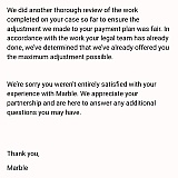 I wanna thank Casey my lawyer and the whole Marble team for the human approach which made a tough legal situation more bearable. My questions were always answered and I was updated as much as I needed during the whole process. My decision to work with Marble wasn't intuitive since this concept is new to me, but I'm very glad to have chosen them and I'm very pleased with the results.