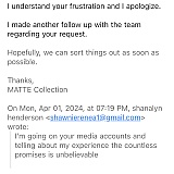 I ordered 5 items from Matte Collection on February 17,2024. I emailed them 5 times regarding the status of my order. Someone finally responded on February 26,2024 advising the order was lost in transit & they were shipping a new order. I finally received my order on March 4,2024… However, there were only 2 items in the package. I've emailed & emailed & emailed to NO response. At this point, I want ALL of my money back & I'll NEVER order from them again!