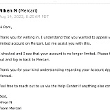 My account was closed with out warning for selling fake cards they have no clue about what is authentic and what is not authentic. They don't give warnings and they won't listen to anything you have to say. I appealed this case after 6 months of being wrongfully accused for selling counterfeit cards. Then they let me back on mercari then 48 hours later they shut my account down for no reason again! They said your account was closed and will remain closed indefinitely. I've purchased the cards they claim to be counterfeit on eBay and they were authenticated by eBay during the time of purchase. They shut my account down when I had just shipped items that I sold and I had to pay usps fees to get the package's intercepted. Mercari and their rude staff has been nothing but a nightmare! Their 1.3 star rating speaks for its self! If you trust this company you will eventually get screwed I guarantee it! They said I created more then one account but I only started a account on google then decided to use apple all my bank info and everything else they ask for was on my apple account my google account didn't even have a profile picture just another false accusation from this so called market place! If you want to take your chances on a market place that struggles getting 1.5 stars that will be the start of the worst nightmare you've ever had! Remember I said that.l