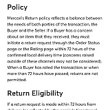 Terrible return policy – buyers beware! I recently bought a necklace for my wife from a "highly rated" seller. The seller's description did not provide any size information, but after scrutinizing the seller's photos this necklace appeared to be reasonably large. As it turned out, the posted photos made it look deceptively large, and the necklace was way too small and would not fit. My return request was denied based on their policy of not taking back items that do not fit. They also protect their sellers well: as soon as I submitted a return request, and also left a message for the seller, I was blocked (either by Mercari or the seller) and could no longer leave a review or contact the seller. No wonder I didn't see any negative reviews. Lesson learned.