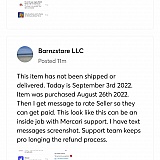 Message by Mercari". Additionally, there are a lot of no star ratings that say that the seller cancelled the transaction, or they appear to be very generic. This makes me suspicious that this is not a real seller. Again - very disappointed in how this was handled, and that I cannot leave a review to warn other buyers. If I had not stayed on top of the shipping tracking, it would have passed the window for me to cancel. However, I did not want to cancel. I really just wanted some type of communication regarding the status of my item. I would not recommend Mercari to others