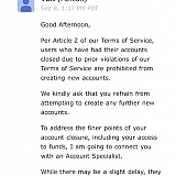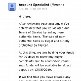 First of all, I have made some sells on mercari. All 5 star ratings. Then suddenly I received a message saying my account is closed due to I have multiple accounts. I only have one account, not sure how they come up with that, then they need to verify my identity again which I already did when I signed up the account. Whatever then I verified my identity, the next day I received a message saying I violated their policy sold non authentic items... omg... that's more frustrating, because everything I have sold are Authentic and buyers gave me 5 stars review. So they decided to close my account and hold my money for ridiculous nonsense reasons they made up! I mean, seriously? I have over $600 in my account and I have to wait 90 days to receive it. To whoever want to buy or sell on Mercari, BE CAREFUL! They will "steal" your money and give you some nonsense reasons, the call center no one can handle this problem, contacted the mercari on Facebook, no one can help either, you can only deal with people that through the App, Email them and wait a day to get back with you, it's BS! Save your time, money and energy sell or buy at somewhere else. I am not gonna let it go, I have talked to attorney general in my state, and we will go from there.