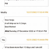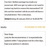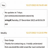 I placed an order in November. After the noted delivery date passed, I followed up on its status. From that moment on, Modlily started to be evasive. First, there was an unexpected delay, and promised delivery within couple of days. When that deadline came and went, then they started to push the date further back. I was supposed to receive the goods on 12/9, which of course they immediately collected the charges for. When I told them Ithat I'll dispute the charge, they declared the order was shipped. However, when I track the order, aside that it's stationary since 12/13, the Post Office tracker said my information doesn't match their record. So this entire month and a half waiting was just to buy them time to clear the charge. This is one of the worst form of crime that these chinese manufacturers are well known for.