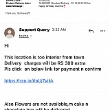 Placed order double checked with availability in that area. And also confirmed with WhatsApp agent. Paid rs 1100 for cake and flowers… after5,6 hours got email that I have to pay extra rs 300 for delivery as it is far from town and flowers are not available.