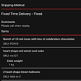 I don't normally give reviews, this has to go out there, firstly we had ordered for a heart shaped cake red roses bouquet and 2 heart shaped blown balloons and to deliver between 10-11 am and paid extra for it but this was only delivered after 4pm with no time sense.