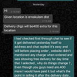 I placed an order, before placing confirmed if they could deliver to location and confirm they can do same day, placed order made payment. I checked later during the day as it was showing pending for delivery and they said as soon as it get delivered it will get updated. After a day later it's still showing pending to deliver and now birthday is already over. I asked on their Wassup chat (as online chat will get deleted when you close the browser)and and they didn't responded same day after a day they came back and said on since the location is in Ernakulam district, it will Rs. 400 more for delivery, their website didn't say anything and was showing free delivery for day time delivery that I chose and took payment. Fine, I don't mind paying money but what's the point of telling this 2 days after birthday. Asked the to cancel the order and refund money at this point as the people who I send gift are no longer at the location now, they are but even responding to chat. They are the biggest scammers and ridiculous customer experience that I have ever seen and experienced. The biggest mistake everybody makes is to order on their website with out checking reviews online / please don't look at their website they can control these positing. Looks like they spend money on google optimization and get customers trapped into their website showing it first in search results. STAYYYYYYY AWAYYYYYH!.