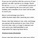 This is the worst company I have ever dealt with. I ordered three wallets and the pictures on the wallets were absolutely horrible. I contacted customer service and they said to send them pictures of the wallets, which I did. They said they looked great and they didn't see a problem with them. On one of the wallets there were dark marks all over the face of my son and the pictures looked nothing like the originals. Absolutely worst thing I have ever bought and customer service is absolutely ridiculous!