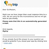 You are not a seriose travel agency. You should be ashamed, it smells MAFIA out of your behavior. I do not recommend you, neither anyone else in your industry. When something happens you become inaccessible and you do not take responsibility, after all the ADD ON we pay for, you suddenly become a mediator and have no responsibility for what has happened. My advice to all of you is book directly from airline or hotel. I have been looking for a link in mytrip's website for 40mn to send a complaint and to get my money back without success. You will not be allowed to run mytrip in this way if you were operate it from Norway. I hope the authorities in Europe somewhere will react, Especially when the customer does not find a form to complaint to get money back.