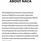 NACA's primary goal is to build strong, healthy neighborhoods in urban and rural areas nationwide through affordable homeownership.