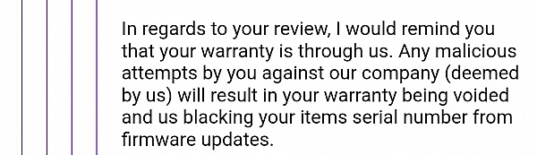 "As per our FAQs, any action we deem malicious we would void your items warranty and blacklist the items serial number from future firmware updates"