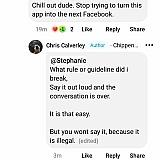 Answer: Kay is right. That is their policy. However, don't expect them to hold to it. We have leads unfairly removing only some people's comments and Nextdoor does nothing about it. Best bet, dump nextdoor.