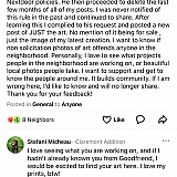 Nextdoor goes beyond outright censorship, which is bad enough, and actually commits libel by selectively deleting posts of those it wants to censor, with the intent to create a false impression of the person Nextdoor is censoring, and what that person is seeking to communicate. Below is a documented example of that in action.