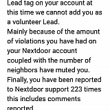Answer: Here's a tidy answer from corporate... Hi Colleen, Thanks for getting back to me. Our Community Guidelines prohibit posting about Lead activity on the main newsfeed. If your Leads are inactivate and youre concerned about moderation in your neighborhood, you should reach out directly to Nextdoor Support. If you have any specific concerns I can help you with at this time, please let me know. Best, Amanda Nextdoor However, the minute you alert corporate to issues with leads in your community you'll find your account terminated. They are very protective of the information surrounding who really is controlling the activities on the boards. Most people in my community are under the misguided impression that corporate is in control. They don't even consider it is their neighbor who sits in judgement.