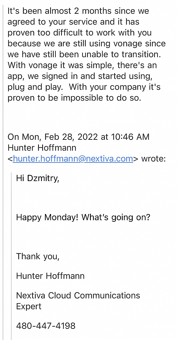 The offboarding and dispute process has been extremely difficult. Nextiva requires disputes to be handled through arbitration in Scottsdale, Arizona, regardless of the customer's location. We are based in California, and when we filed a case locally (where the agreement was signed), Nextiva had it dismissed and insisted that we proceed in Arizona instead. This made the process costly, time-consuming, and impractical, especially for a charge related to services that were never provided.