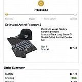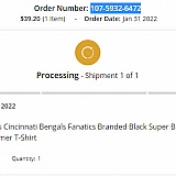 Ordered January 31 and tracking shows arrival February 21 which is after the Super Bowl. They are misleading people that the merchandise will ship prior to the Super Bowl. Currently on the website the shirt I ordered shows it will ship no later than February 10.