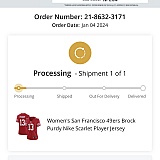 My order (superbowl jersey) was supposed to arrive on 02/09/24 as stated before I made my purchase however it did not. It is no point in having it delivered one day after the superbowl. The only resolution was a discount which makes no sense because the sole purpose of placing the order was to receive it before the superbowl. False advertisements.