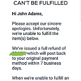 Hello Timothy, thank you for your feedback! I am very sorry the cancellation of your order. Our number one concern is customer satisfaction. Upon review, the order was placed at 10 pm and your correspondence was received an hour later. Unfortunately, after 30 minutes of the order being placed, the order goes into production. However, the Advocate was able to open a ticket to have the order cancelled. You were refunded back to the method of payment used to make this purchase. Please allow two to seven business days to reflect on your financial statement. Once again, I apologize for any frustration this may have caused you. Sincerely, Juliain