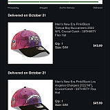 Ordered 4 hats in October, received 2 (TB and Chargers) fairly quickly and now it is December and still don't have the other 2 hats. Tracking says delivered yet didn't receive them. Ordered two sweatshirts, also says delivered for both but didn't receive either and then received a modest refund of $60 for and $85 item. Customer service is a joke, nobody to actually talk to about problems like this. Will NEVER order anything here again. They basically stole almost $400 from me and I received two hats. So frustrating