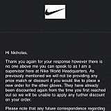 I orderded a baseball glove which we received the wrong one, due to a mistake with the web photo. Nike made my son think we can get him a glove we could not afford. They refused to make a price match and the mistake is still on the website today. I am very upset and disappointed in a company that we have used for years. The customer service rep send me an email specifically telling me not to writer anymore and if I did, they would not answer. I am not asking for anything that any other company would not do, as it is the decent thing to do. I feel that since they are such a big company, and our kids just want to wear the product that big athletes are sponsored by, they can do what ever they want, and losing 1 customer is not big deal. They don't feel like they need to satisfy a customer.