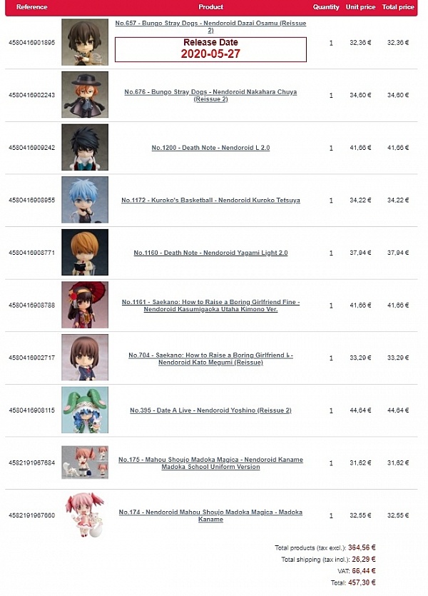 I placed several orders for Nendoroids. Received 1 order in a timely manner and no problems. My friends had told me to pick this site to order from and, to be fair, the reviews were a lot more positive back then. It's been over 6 months now that my other orders should have started shipping to me. I got no response on four tickets until I told them I will take this up with my creditcard company. Now they are saying they cannot cancel my orders (I told them to cancel and refund; I will take my money elsewhere) because they are ready to ship. But they are no longer providing the shipping method (Transi-Logistics) which I picked and which the payment was agreed on. Now they want me to pay extra to send me the figures... sorry what?! Legal action should be taken against this company and it should cease to exist. I see now that, especially since December, their reviews are all but positive. Buyer beware, please order from any other site like Solaris Japan, never from Nippon Yasan. Do not fall in their trap.