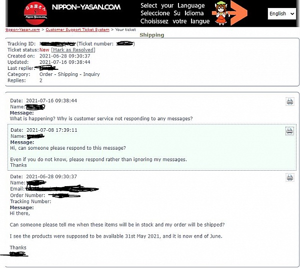 I had a $250+ order that has never shipped from Nippon-yasan. I have contacted their live chat support multiple times and have been promised time and time again my issue would be taken care of and it never has and chat support keeps lying. I was told to make my ticket "Attention Nakamura" but this Nakamura has never responded. I have opened multiple tickets with them and they keep closing them. I have demanded my money back but have never received a response. Their phone number always goes to voice mail and says they're closed even when they're supposed to be open. This store is completely incompetent.