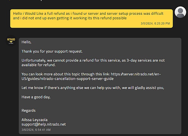 . I Bought Nitrado for 3 days as I was interested in it I then proceeded to try to set up my server the UI was overly confusing and made no sense I was unable to access configs and then asked for a refund as I bought it 20 minutes ago they then declined my refund. I rate this 0/10 it is horrible please go somewhere else then this is a scam