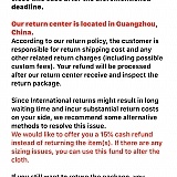 I ordered 3 blouses, each one arrived 3 sizes too big and 2 were not the color I ordered. I emailed that I would return all 3 items and was told I would have to pay shipping costs back to China (even though clothes were shipped from the state I live in) + customs fees. I was offered a 15% refund instead- which i accepted. Of course, I never received the refund on my paypal account. I donated the blouses to a thrift shop.