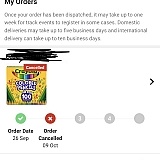 I bought 100 crayons deal on 26/09/2019. Expecting to receive up to 15/10/2019. On the 9/10 my order got canceled and I wasn't told. I contacted them and they blamed the supplier. TODAY is 19/10 and they has EXACTLY the same deal going on! Why couldn't they asked I I wouldn't mind waiting for 4 FOUR more days? Or even 10 more days?